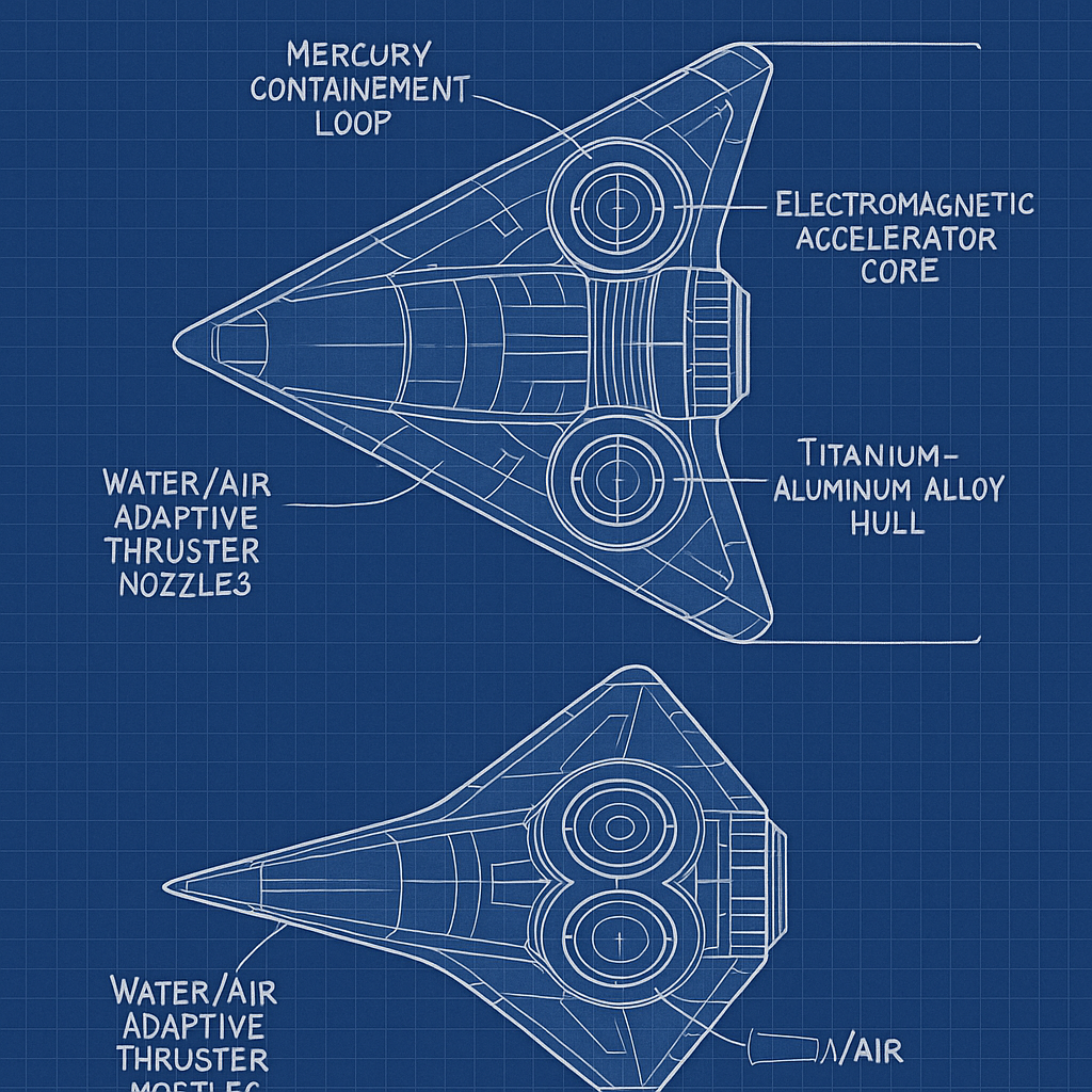 This advanced craft blends declassified U.S. military technologies, speculative alien/UAP propulsion principles, and cutting-edge physics involving mercury vortex compression, anti-gravity theory, and electromagnetic containment fields.